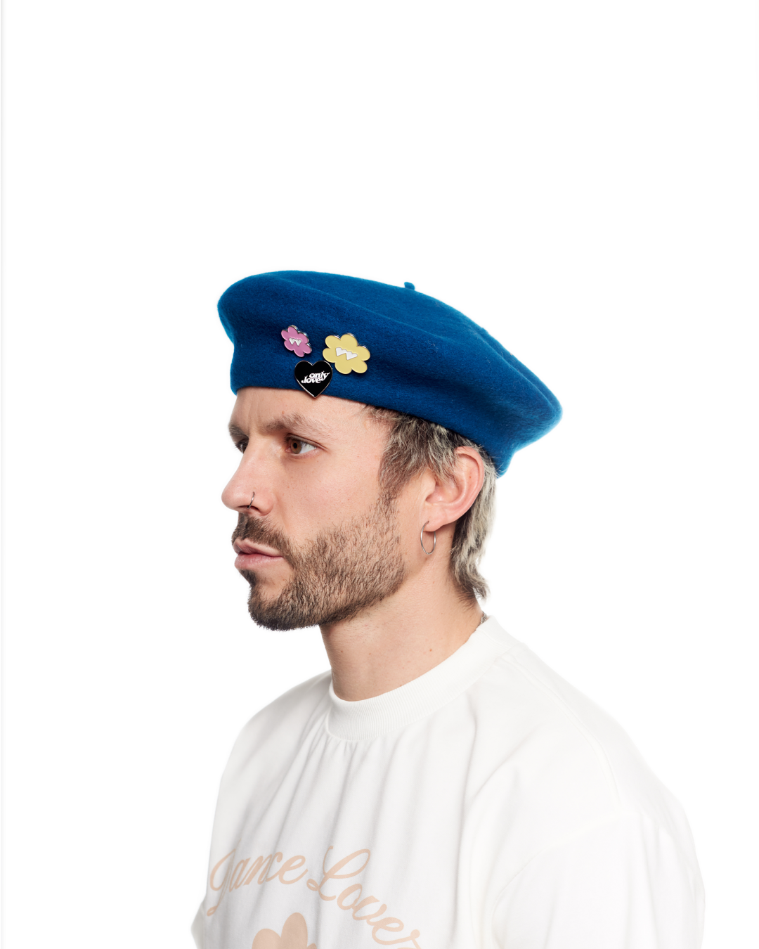 Берет с тремя значками на фронтальной части изделия. Состав: 100 шерсть